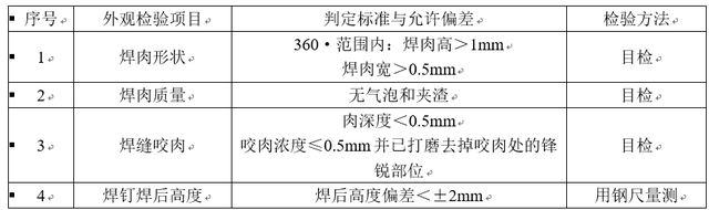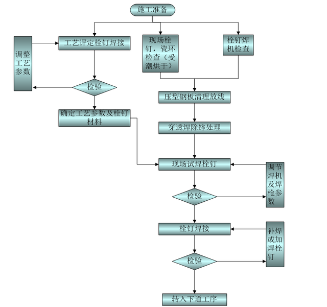 若继续检测,任何栓钉上产生不合格现象,就要修改工艺,并增加的栓钉焊在单独的材料上,焊接的数量和检测按规范执行, 如果增加的栓钉焊接也失败,那就应在另一块钢板上继续,直到两个栓钉的焊接都合格。