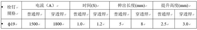 c焊接电压,电流,时间及栓钉枪提起和插下等参数都要调到最佳状态,这将根据过去的经验和栓钉制造厂以及设备制造厂的说明来进行。